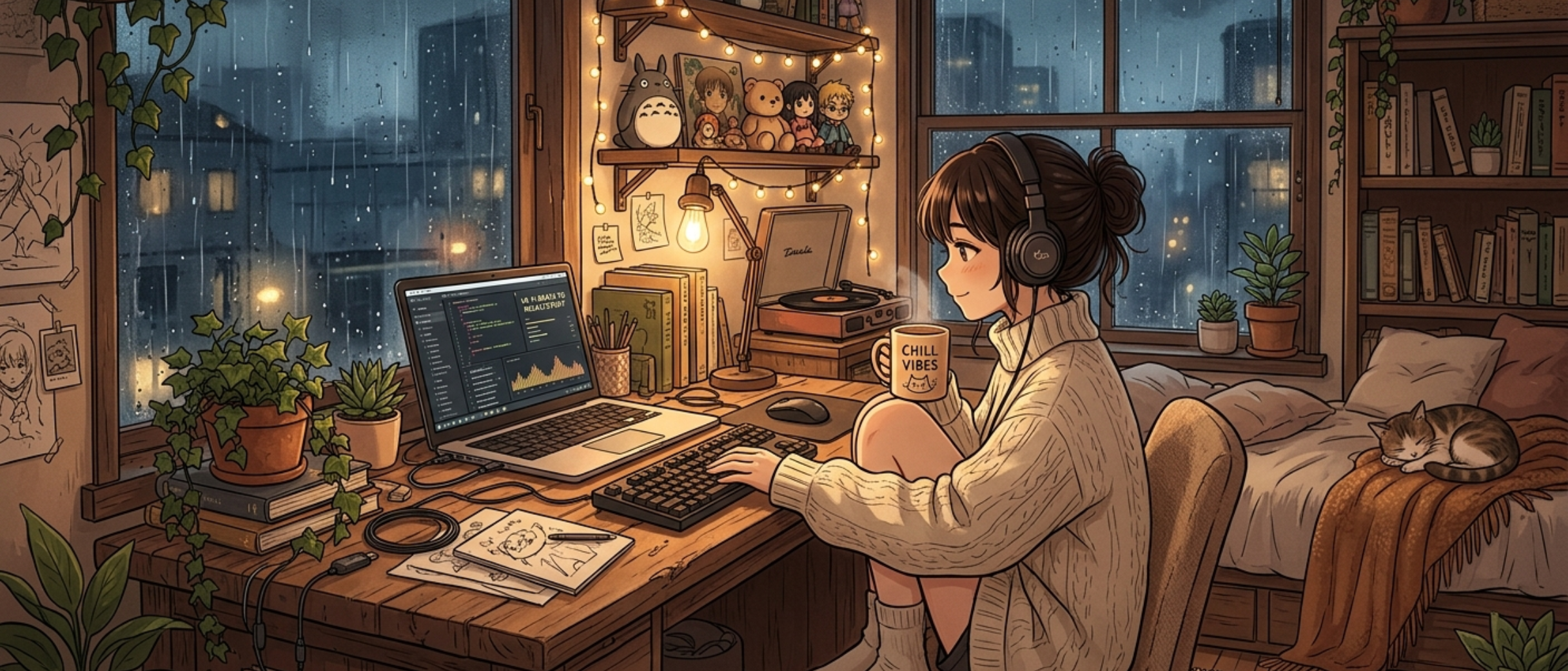 - A central illustrated scene. A character at a desk, a cozy room, a rainy window